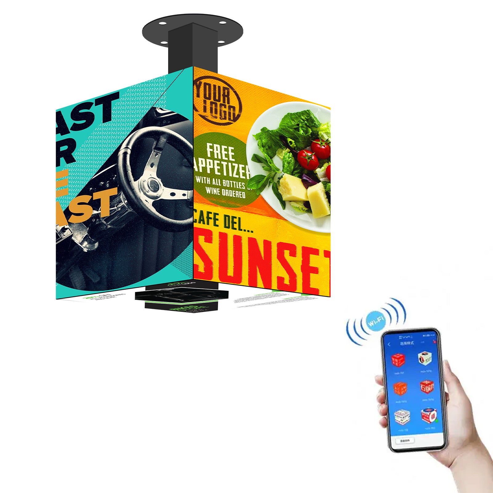 6 faces inclined floor-standing LED display cube also can be made with rotating bracekt turn into a Rotating Cube LED Display, which is much more eye-catching.