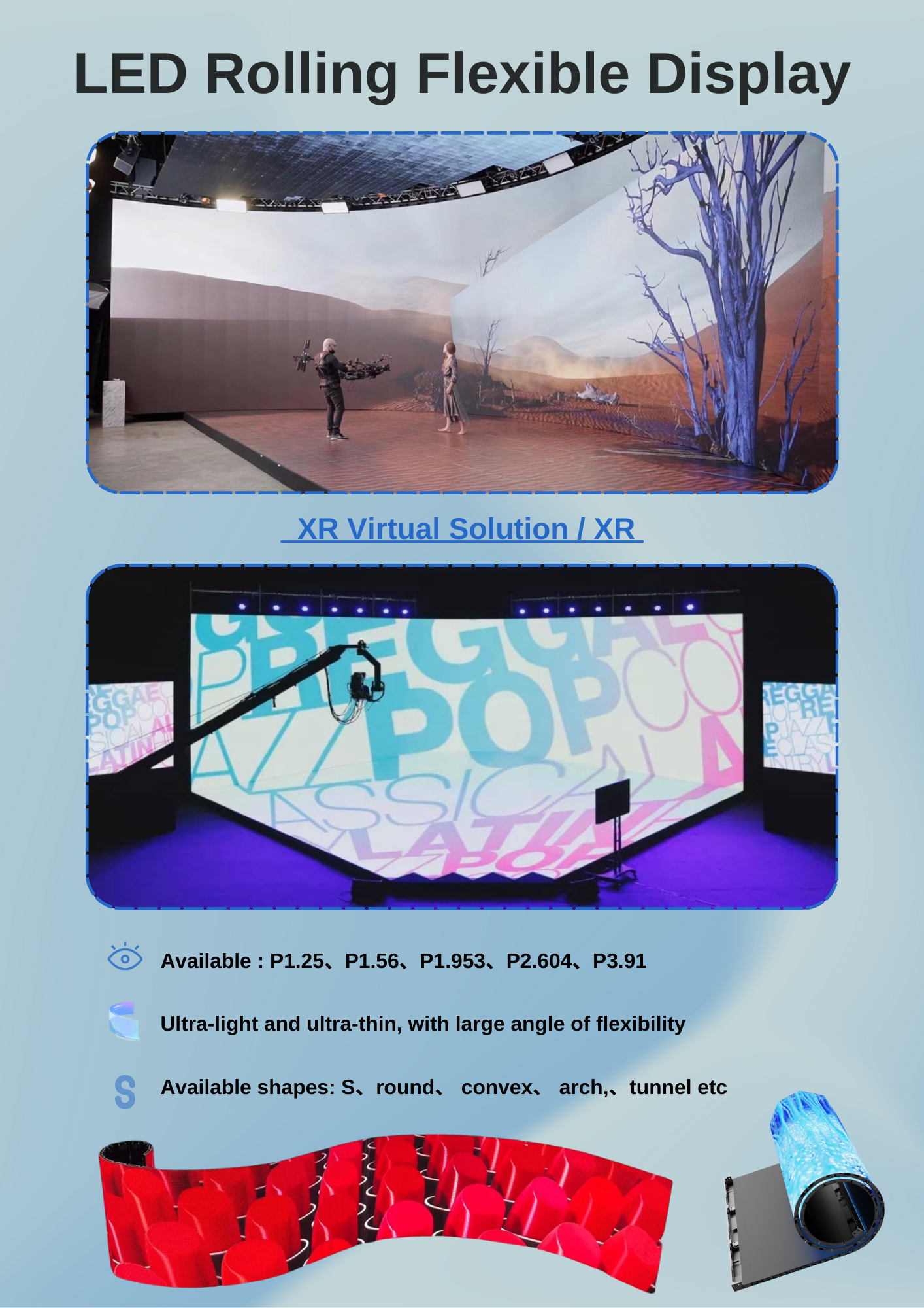 LED Rolling Display screen is flexible and linkable, so can be used to make large LED video wall with wave or curve. And for it's high definition, it's a ideal product for making XR studio.